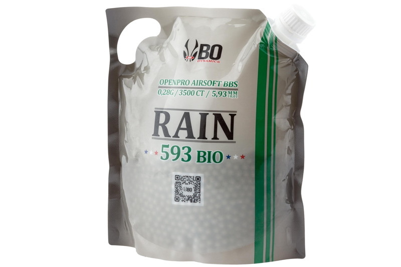 Sachet de 3500 billes 0.28 grammes Bio de la marque RAIN BO-DYNAMICS, idéal pour alimenter vos répliques de poing et répliques longues d'airsoft.
