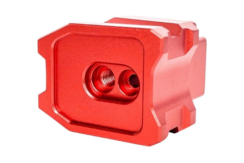 On retrouve ici une extension de chargeur fabriquée en aluminium CNC de couleur rouge pour chargeur de réplique de poing AAP-01 GBB de chez AAC.