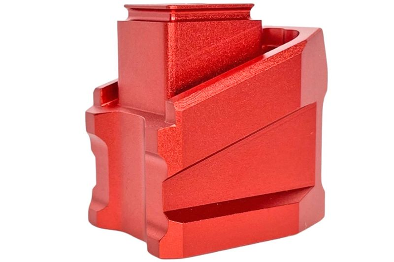 On retrouve ici une extension de chargeur fabriquée en aluminium CNC de couleur rouge pour chargeur de réplique de poing AAP-01 GBB de chez AAC.