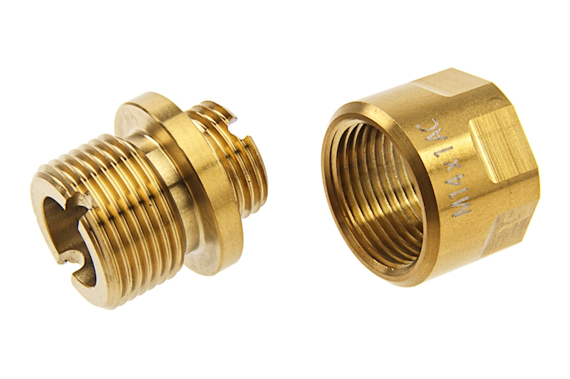 Adaptateur 14mm CCW Gold de marque COWCOW Technology, idéal pour adapter un silencieux sur votre réplique de poing airsoft munie d'un pas de vis 11 mm CW.