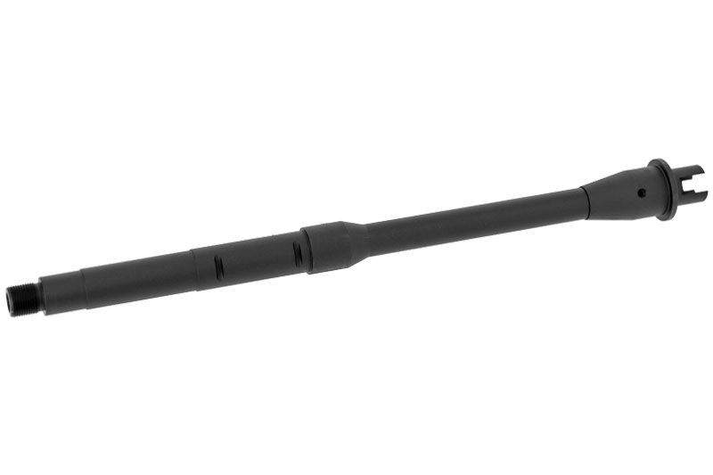 On retrouve ici un canon externe carbine d'une longueur de 12.5 pouces fabriqué en métal de couleur noir compatible avec les répliques type M4 / MK18 / MTR MWS GBBR de chez Tokyo Marui. Ce canon dispose d'un filetage 14mm CCW. Idéal pour personnaliser votre réplique airsoft et y ajouter un cache flamme / tracer / silencieux !