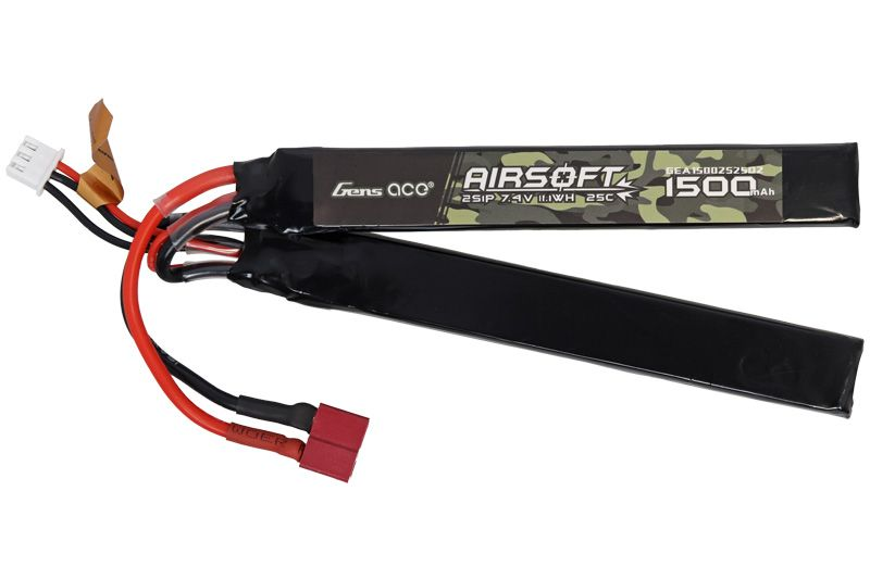On retrouve ici une batterie double stick 7.4v 1500mAh avec connectique Dean. Idéal pour alimenter votre réplique airsoft AEG.