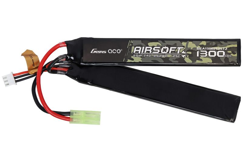 On retrouve ici une batterie double stick 7.4v 1300mAh avec connectique Tamiya. Idéal pour alimenter votre réplique airsoft AEG.