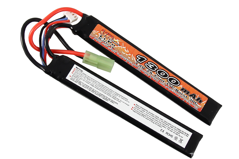 Batterie Lipo 7.4V 1300mAh 15C double stick de la marque VB, idéale pour alimenter votre réplique airsoft AEG.