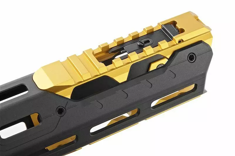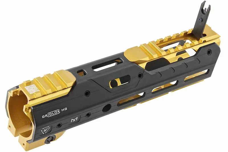La firme propose ici un garde main quick detach 8.5" GRIDLOK avec base noire et rails amovibles version TITAN (Or).