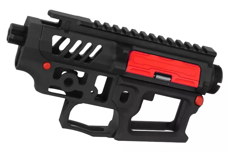 On retrouve ici un corps M4 CNC Skeleton Red / Black, idéal pour personnaliser votre réplique airsoft et lui donner un look hors du commun.