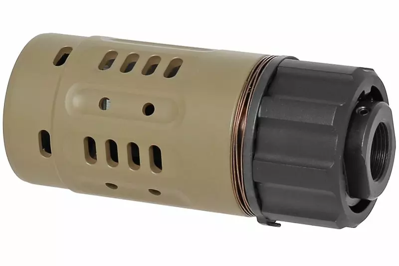 On retrouve ici un muzzle brake & cache flamme DA de couleur DE et noir fabriqué en aluminum et métal. Le cache flamme dispose d'un filetage 14mm CCW et le muzzle brake se fixe via un système quick detach. Idéal pour personnaliser votre réplique longue d'airsoft !