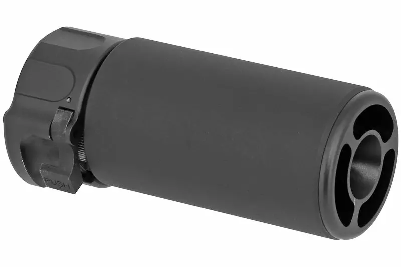 On retrouve ici un silencieux Warden V2 fabriqué en aluminium CNC et métal de couleur noir. Ce silencieux est QD et est livré avec son cache flamme fileté en 14mm CCW. Idéal pour personnaliser votre réplique d'airsoft longue.