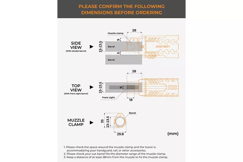 ACETECH propose un silencieux traceur lumineux avec simulateur de flash effet birfrost multi couleurs dédié aux répliques airsoft fusil à pompe type M870 Tokyo Marui, idéal pour pouvoir jouer à la bille traçante sur votre réplique airsoft et disposer d'un effet de tir hors du commun.