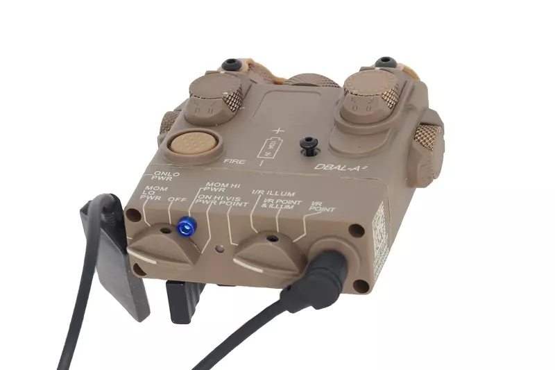WADSN propose un boitier DBAL-A2 Aiming Device ABS Version Désert disposant d'une lampe 200 Lumens. Vous pourrez sélectionner chaque mode grâce à deux sélecteurs et déclencher par l'intermédiaire d'un bouton intégré ou du switch déporté fourni.
