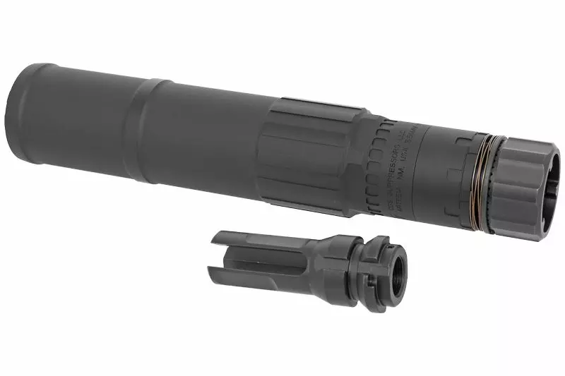 On retrouve ici un silencieux dummy CGS QD de 230mm de long fabriqué en aluminium et métal de couleur noir fileté en 14mm CCW. Dispose d'un emplacement pour y glisser un module tracer à l'avant du silencieux (diamètre interne de 36mm) et est livré avec son cache flamme QD ainsi que son adaptateur 14mm CCW. Il est pourvu d'une rallonge de canon interne. Idéal pour personnaliser votre réplique airsoft.