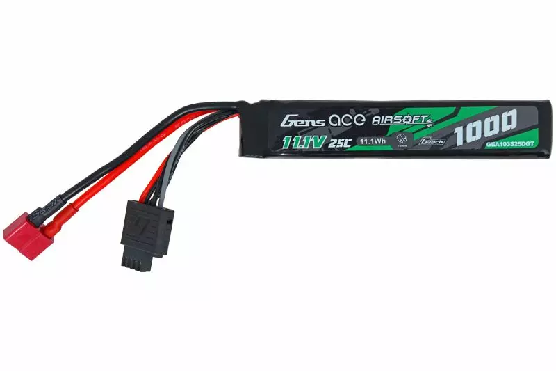 On retrouve ici une batterie LiPo stick G-Tech 11.1v 1000mAh 25C / 80C (Burst) avec connectique Dean. Idéal pour alimenter votre réplique airsoft AEG.