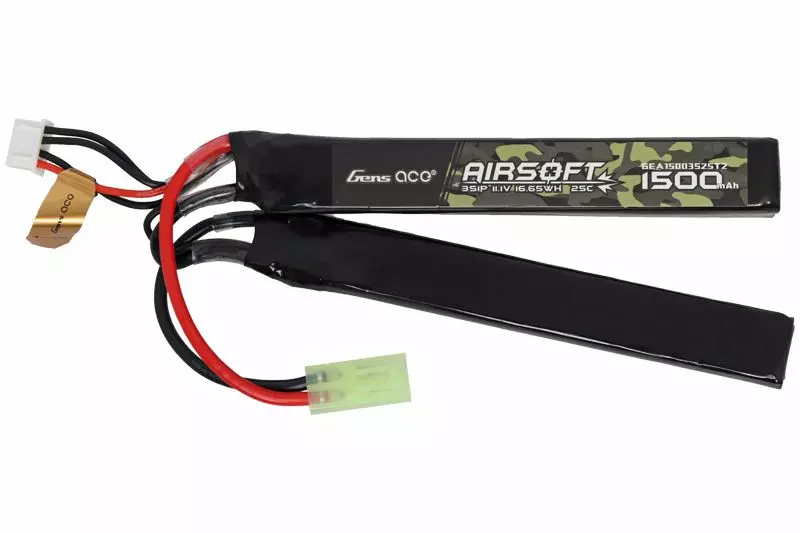 On retrouve ici une batterie double stick 11.1v 1500mAh avec connectique Tamiya. Idéal pour alimenter votre réplique airsoft AEG.