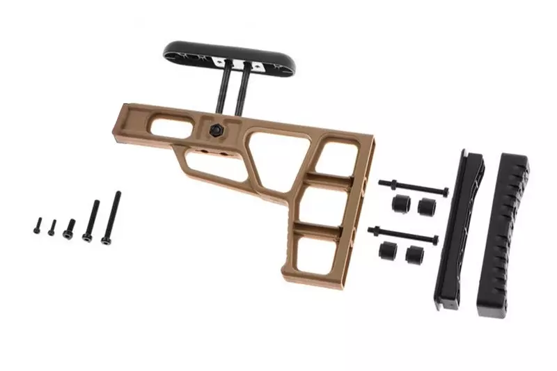 On retrouve ici un kit crosse MLC-S2 FDE pour réplique airsoft sniper VSR-10. Cet accessoire est conçu en polymère hautement résistant. Le kit est fourni sans adaptateur Picatinny, qu'il faudra vous procurer pour installer la crosse sur la réplique.