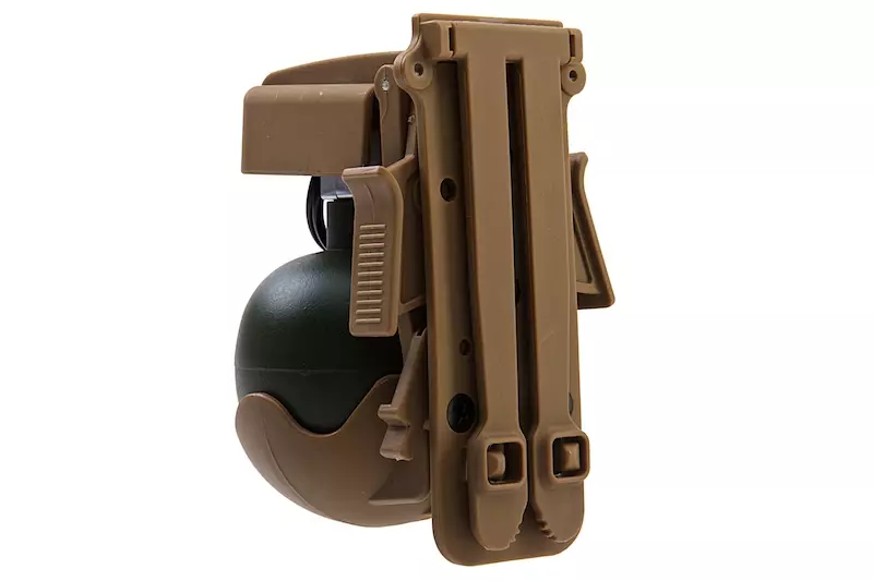 Grenade Frag M67 factice avec son support QD Molle Coyote Brown de marque TMC, idéale pour personnaliser votre tenue d'airsoft !